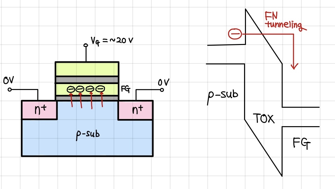 Program 동작에서는 source/drain 및 기판을 모두 접지 (0 V)한 상태에서 CG에 높은 양전압을 가해줍니다. 그러면 p-sub에 있던 전자가 band bending에 의해 얇아진 oxide를 tunneling하는 FN tunneling에 의해 FG로 이동하게 됩니다.