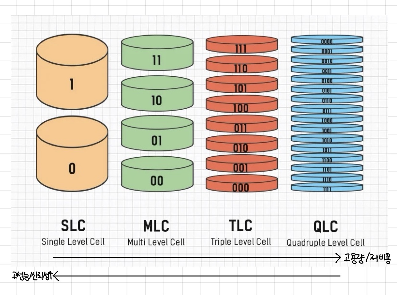 정리하자면, 한 cell에 많은 bit를 저장할수록 동일 면적 대비 용량이 증가하고 비용은 감소합니다. 하지만 속도가 느려지고 신뢰성에 이슈가 발생하게 됩니다.
