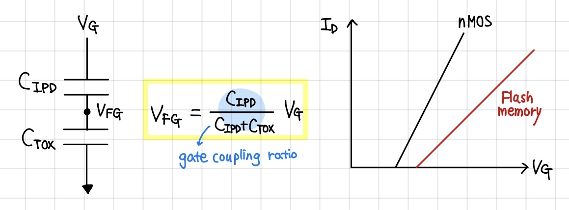 FG flash memory는 외부로부터 제어 게이트 전압인 VG가 인가될 때, 실제 트랜지스터 동작은 VFG (FG 전위)의 역할을 받습니다. VFG는 CIPD와 CTOX의 coupling capacitance에 의해 결정됩니다.