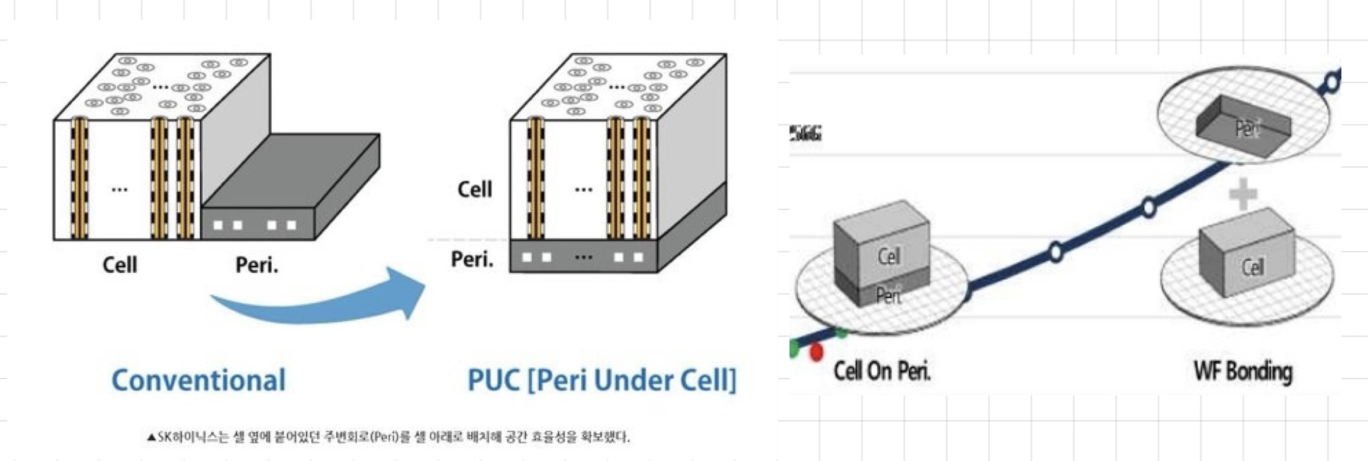이는 Cell side에 위치했던 주변회로부 (periphery)를 cell 아래로 제조해 공간의 효율성을 늘리는 방식입니다. Peri를 제작한 후 위에 cell을 제작하는 방식을 사용하거나, peri와 cell 공정을 따로 제작해 하나로 붙이는 '본딩'의 방법도 있습니다.