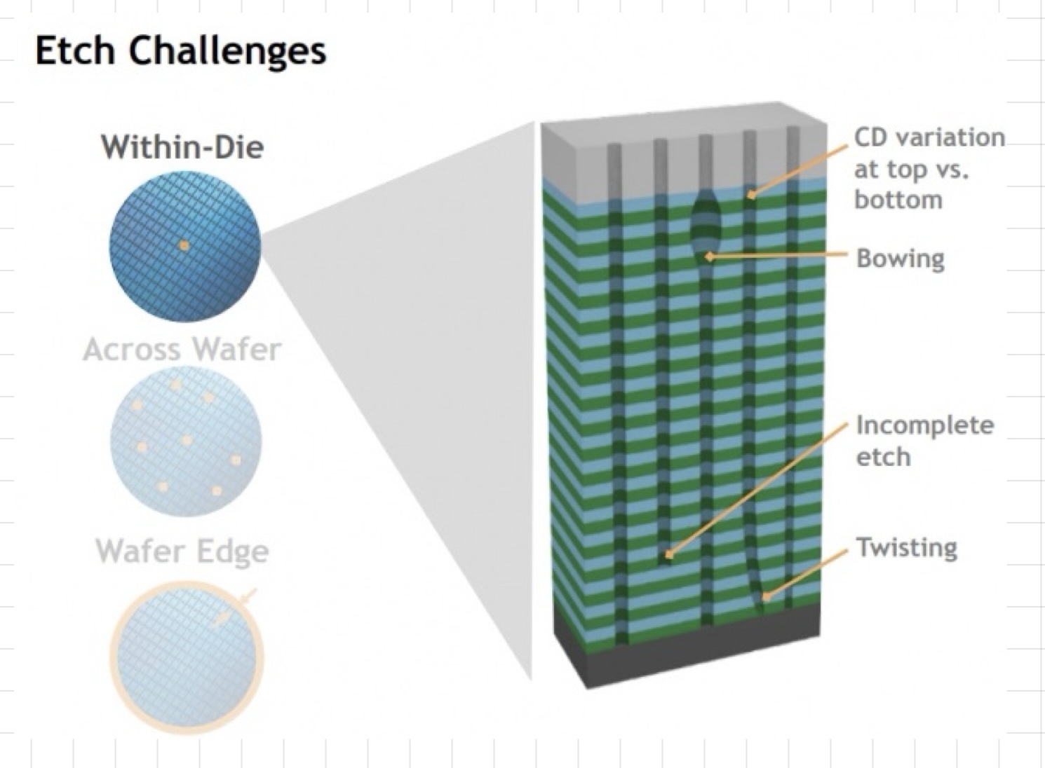 단수가 높아질수록 맨 위부터 채널 홀을 일정하게 뚫는 etch가 어려워집니다.
