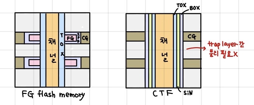 또한 FG는 도체이기 때문에 인접 cell과 FG를 분리해야 합니다. 하지만 CTF의 SiN는 부도체이기 때문에 셀 간 분리 과정을 생략할 수 있습니다.