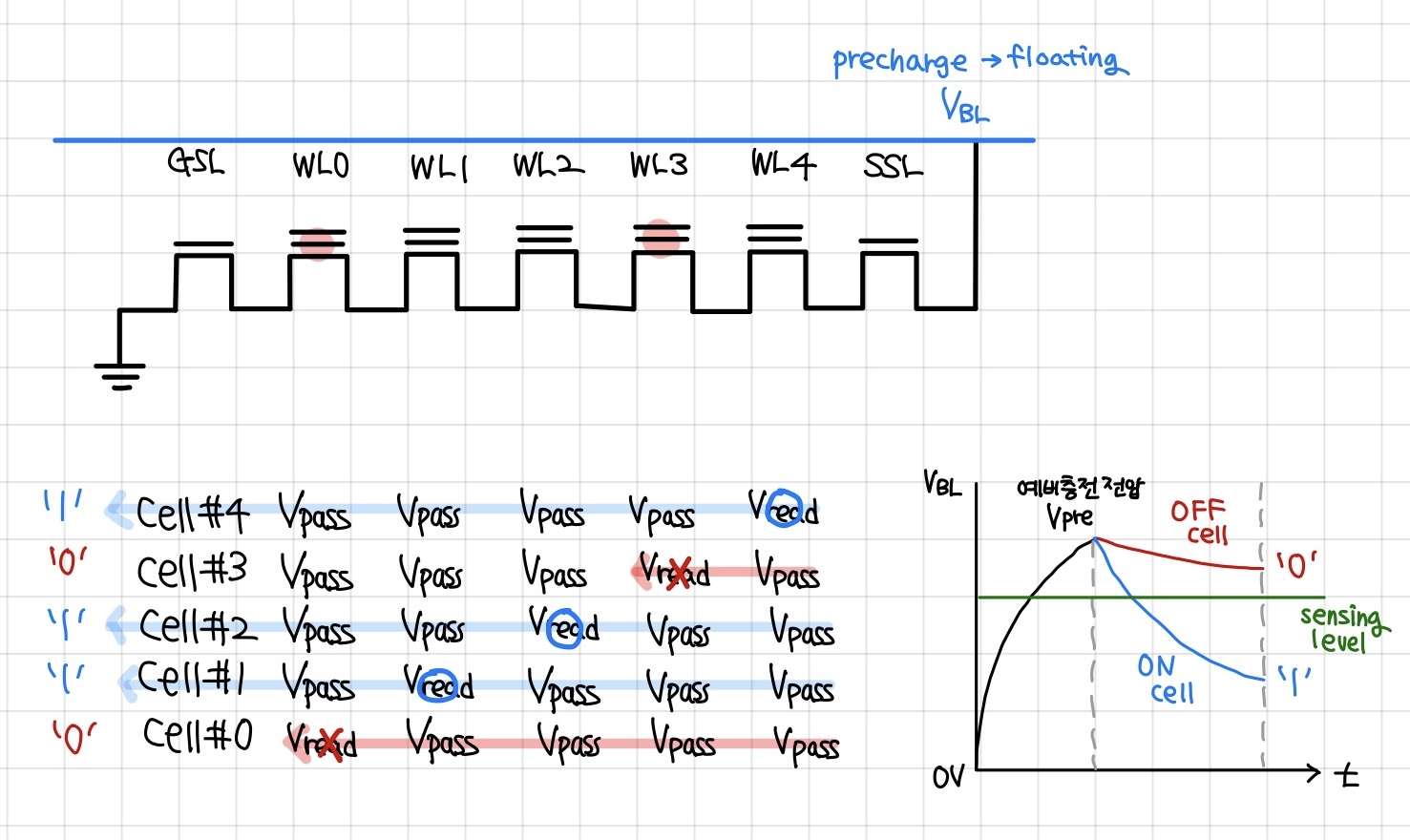 선택된 cell이 erase된 상태라면 cell string을 통해 BL에 선충전된 전하가 방전되어 BL 전위가 감소하게 됩니다. 반대로 program 상태라면 선택 cell이 OFF 되어 BL에서 선충전된 전하가 거의 방전되지 않습니다. 따라서 VBL에 따라 '0'과 '1'을 판단할 수 있게 됩니다.