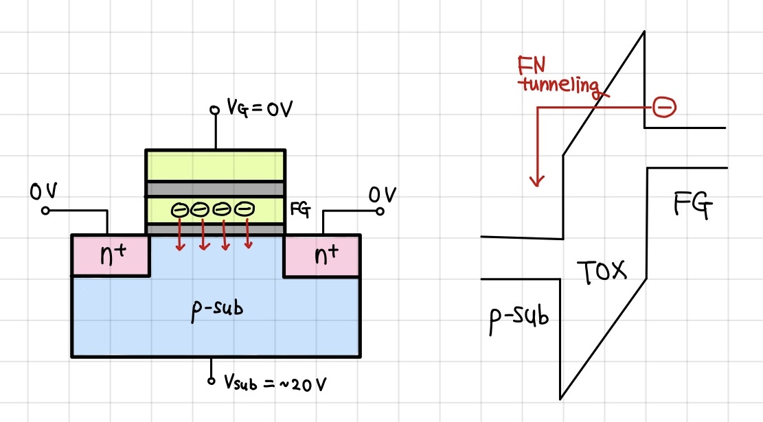반대로 erase 시에는 기판에 20 V 정도의 양전압을 인가해 FN tunneling에 의해 FG의 전자가 p-sub으로 tunneling되도록 합니다. 이때 게이트에 -20 V를 인가해도 되지만, 회로 측면에서는 -20 ~ +20 V 총 40 V를 생성하는 power source를 설계해야되기 때문에 p-sub에 20 V를 인가하는 것이 유리합니다. 따라서 erase 동작은 기판이 공통적으로 묶여있는 block 단위로 진행됩니다.