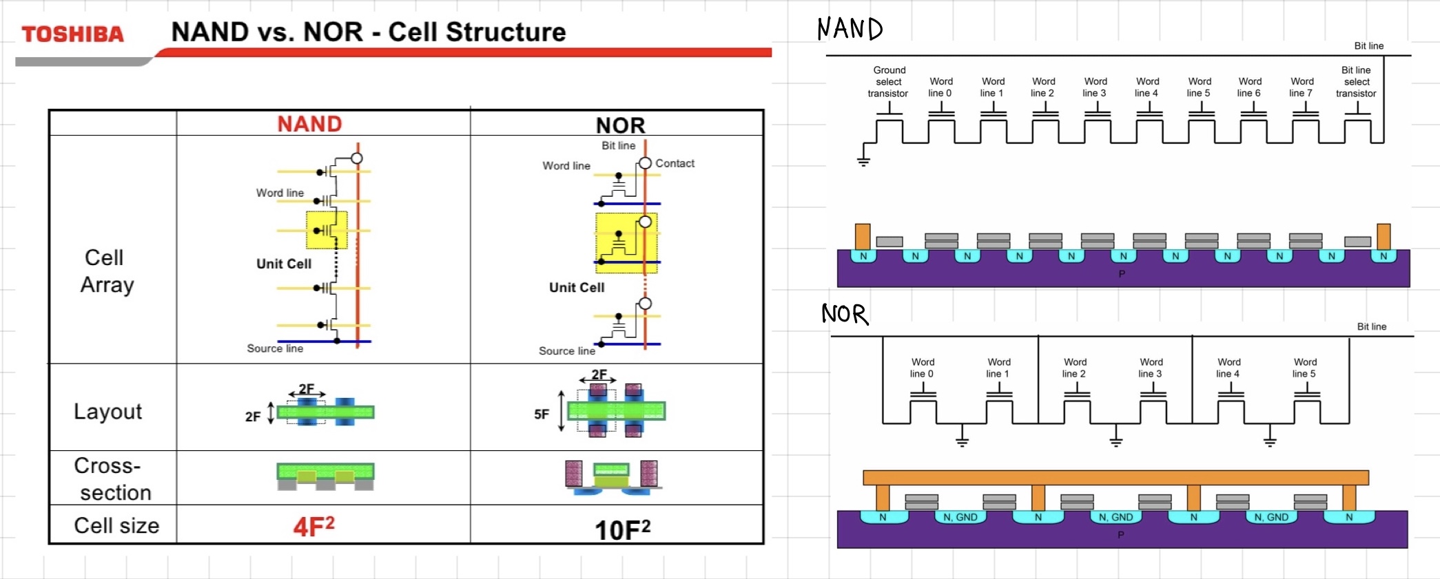 Flash memory의 동작 원리를 살펴보기 이전에 flash memory는 셀의 연결 방법에 따라 NAND flash와 NOR flash로 구분되는데요, 이에 대해서 설명해보도록 하겠습니다.