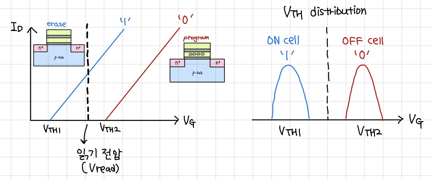 VTH1과 VTH2사이에 위치한 Vread를 인가하면 program 상태의 cell은 OFF상태 '0'가 되고, erase 상태의 셀은 ON 되어 (전류가 흘러) '1'이 됩니다.