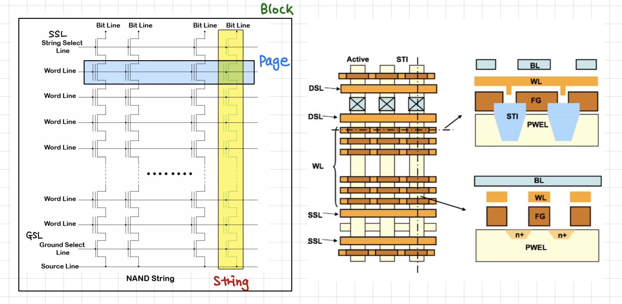 String: SSL (String Select) Tr과 GSL (Ground Select) Tr 및 flash memory cell들이 직렬로 연결되어 있는 단위입니다. SSL Tr은 모든 block을 공유하는 BL에서 특정 string과 연결해주는 스위치이고, GSL Tr은 해당 string을 접지에 연결되어 있는 소스 라인과 연결시켜주는 스위치 입니다. String은 read의 최소 단위로, 32/64 cell이 직렬로 연결되어 있습니다.