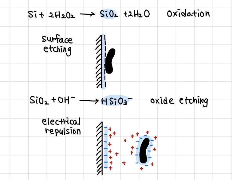 실리콘 표면에서 H2O2를 통해 산화된 SiO2 층이 NH4OH의 OH-에 의해 HSiO3-이 되고 이는 수용성이기 때문에 물에 녹으면서 particle이 떨어져 나가게 됩니다. 혹은 유기물이 아닌 particle의 경우에는 OH- 이온들이 particle과 Si 표면에 달라붙어 서로 척력에 의해 제거하는 방식도 있습니다.