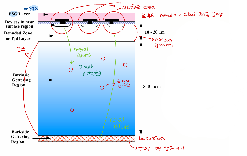 Metal ion의 경우 wafer backside에 trap layer를 형성하여 이 영역에 metal ion들을 trap 시키거나 (extrinsic gettering) 웨이퍼 내부에서 열처리를 통해 산소 침전물을 형성하고 defect를 유도하여 금속 불순물을 포집함으로써 불순물을 제거하는 방식 (intrincsic gettering)이 있습니다.