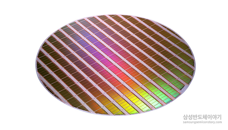 위의 단계를 거쳐 완성된 bare 웨이퍼 위에 여러 공정 과정을 거쳐 IC를 형성하고 가공 단계를 거치면 아래와 같은 웨이퍼가 완성됩니다.