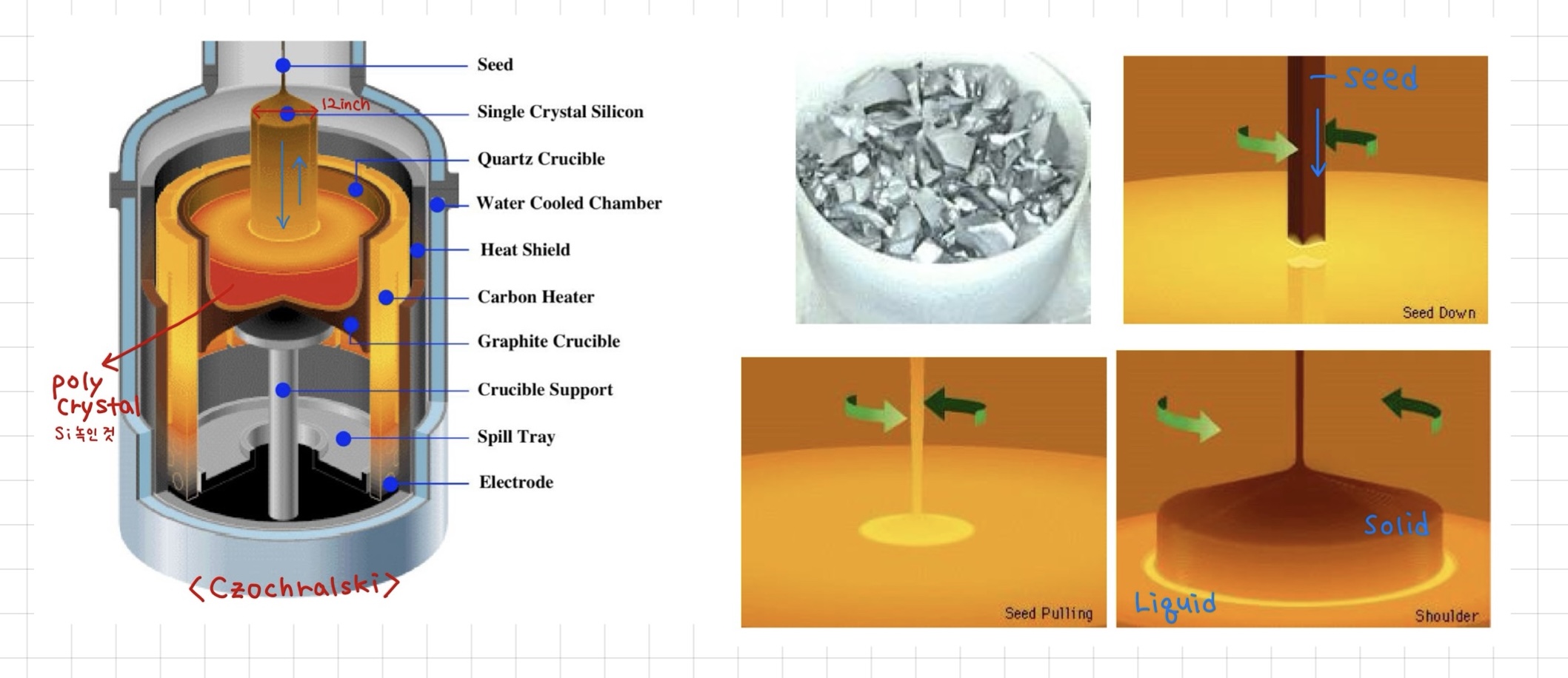 Furnace 도가니에 고순도 poly Si을 녹입니다. (참고로poly-Si는 1417 ℃ 가까이에서 녹습니다.) 그리고 작은 단결정 Si을 seed holder에 장착한 후 seed와 고순도 액체 poly Si을 접촉시킵니다. 이후 seed holder를 천천히 회전시키면서 위로 끌어올리면 이 seed 단결정 구조에 맞춰 crystal이 성장하게 되고 그 결과로 ingot이 형성됩니다.