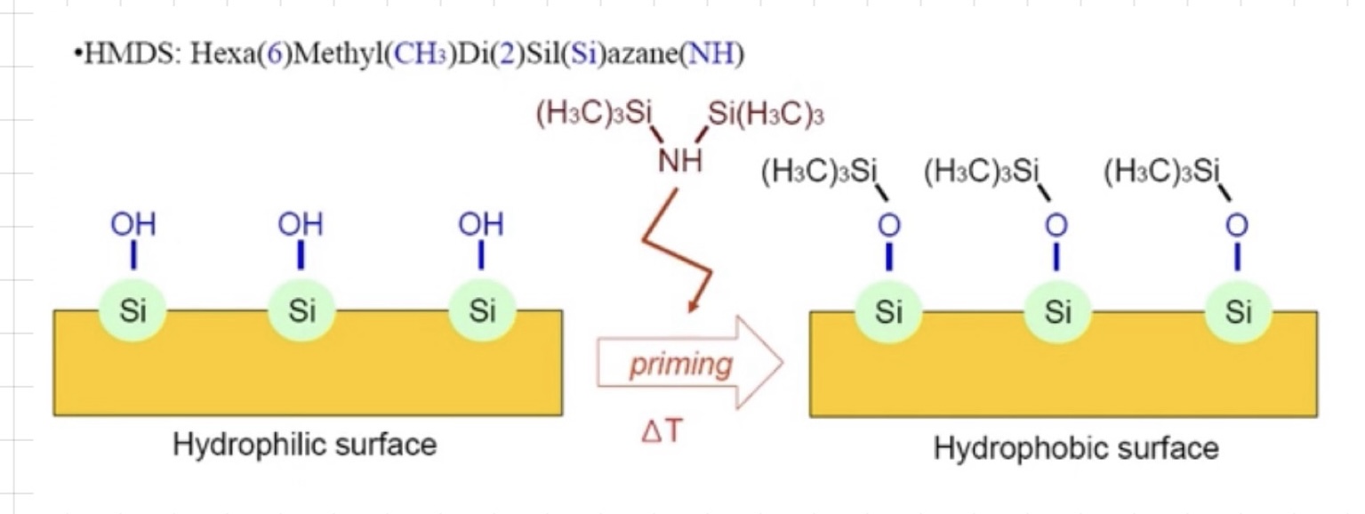 따라서 HMDS라는 화합물을 진공에서 기화시켜 표면처리하여 웨이퍼 표면을 소수성으로 바꿔주는 wafer prime 단계를 거칩니다.