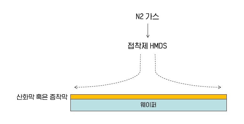 오일 성분인 HMDS를 도포할 때는 N2가스를 이용하는데, 밀폐된 좁은 공간으로 먼저 HMDS를 밀어 넣고 N2를 일정한 압력으로 불어 넣어 강제로 HMDS가 막 위에 얇게 펴지게 합니다.
