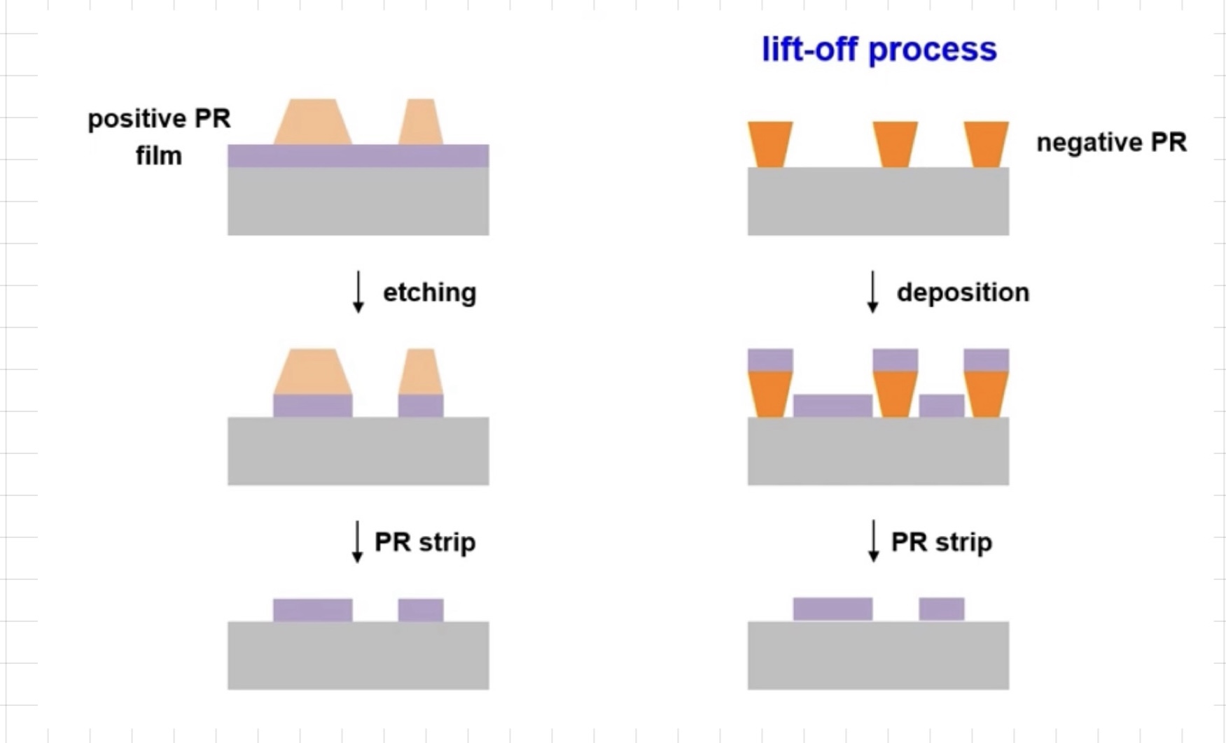 Negative PR은 lift-off 공정을 통해 Pt와 같이 etch가 어려운 소재에 대해 패터닝을 진행하는 데 쓰이기도 합니다.
