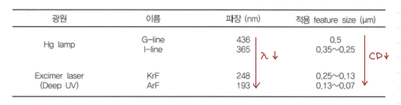 가장 첫 번째 방법으로는 광원을 수은 램프에 의한 g-line (436 nm), i-line (365 nm)의 근자외선 (UV)에서 KrF (248 nm), ArF (193 nm) excimer laser를 이용한 원자외선 (Deep UV, DUV)로 변경하면서 파장을 줄이는 것입니다.