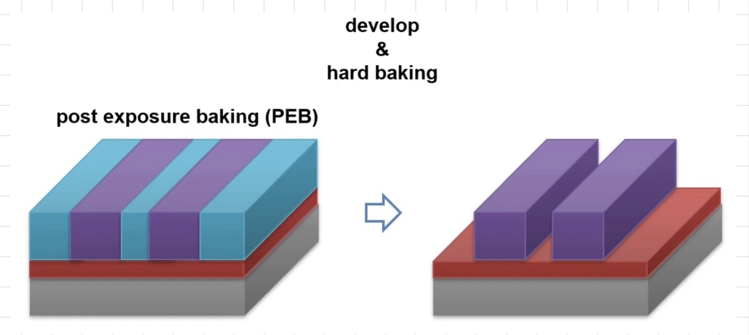그후 UV가 조사된 PR을 다시 한 번 구워주는 PEB를 진행합니다. 이 PEB 단계가 아래 부분에서 설명드리도록 하겠습니다. PEB 후 developer (현상액)에 담구게 되면 빛을 받지 않은 부분들이 developer에 용해되어 제거됩니다. (negative PR의 경우) 이후 hard bake 과정을 통해 남은 PR을 아주 딱딱하게 굳혀줍니다.