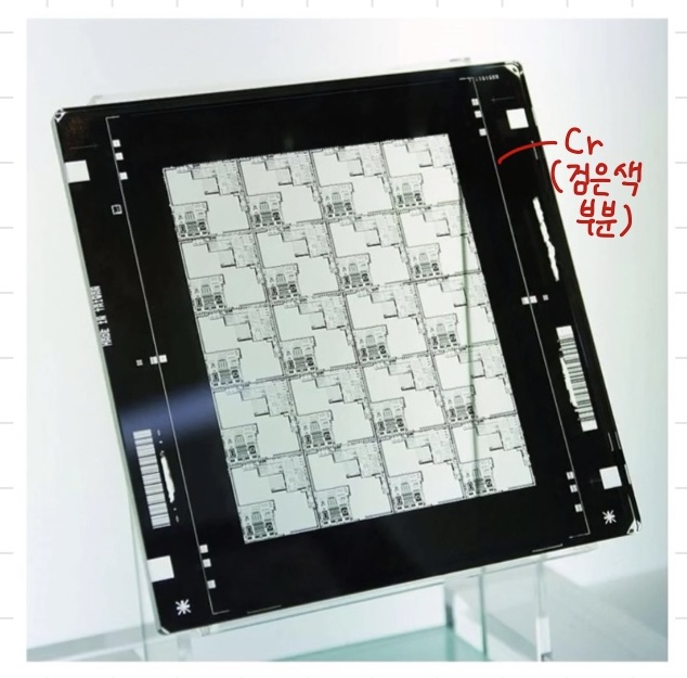 마스크는 위의 그림과 같이 생겼는데요, 투명한 유리 기판 위에 Cr으로 빛이 투과되지 못하도록 패턴을 형성해 놓은 것입니다. Cr로 가려진 부분 이외에는 빛이 그대로 투과하게 됩니다.