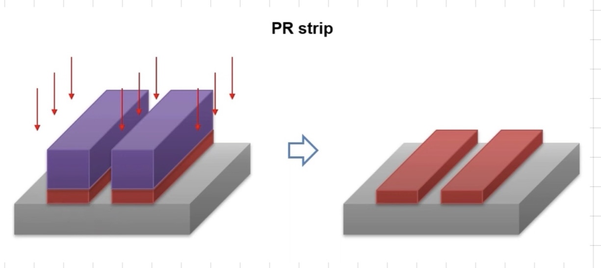 식각 후 필요 없어진 PR을 아세톤과 같은 유기용매 or Piranha (단, 금속을 녹이는 문제가 있음) 에 넣어 제거하거나 PR remover, 혹은 O2 plasma ashing을 사용하여 제거합니다.