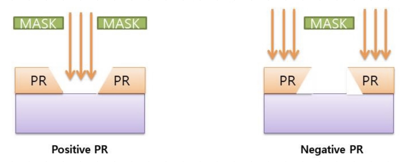 Positive PR의 경우 노광된 부분의 PR이 develop을 통해 제거되는 것이고, negative PR의 경우에는 반대로 노광되지 않은 부분이 제거됩니다. 그 이유는 positve PR의 경우 빛을 받은 부분의 polymer 결합이 약해지고, negative PR의 경우는 강해지기 때문입니다.