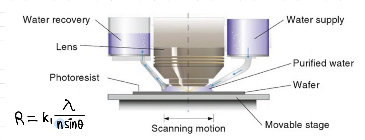 따라서 빛이 조사되는 매질을 물로 바꾸어준다면 n이 커져 R을 감소시킬 수 있게 되고, 이러한 방식이 바로 액침노광입니다. 이를 통해 0.93에 해당하는 NA를 1.35까지 구현할 수 있었습니다.