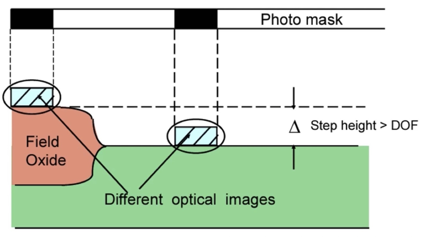 DOF가 작아지면 단차가 존재하는 패턴 상에서 포토 공정을 진행할 때 오류가 발생할 수 있습니다. 아래의 그림과 같이 오른쪽 패턴의 경우에는 DOF 범위에서 벗어나기 때문에 초점이 맞지 않아 원하는 패턴을 형성할 수 없게 됩니다. 즉, 위쪽과 아래쪽에 같은 패턴을 형성할 수 없게 됩니다.