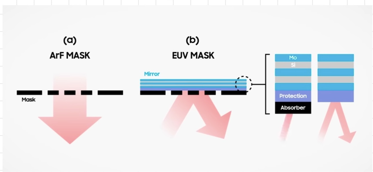 EUV 장비에 사용되는 마스크 또한 반사를 이용하도록 제작합니다.