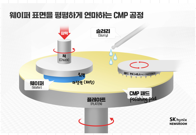 CMP는 물리-화학적인 방식을 이용해 웨이퍼를 갈아내는 방식입니다.