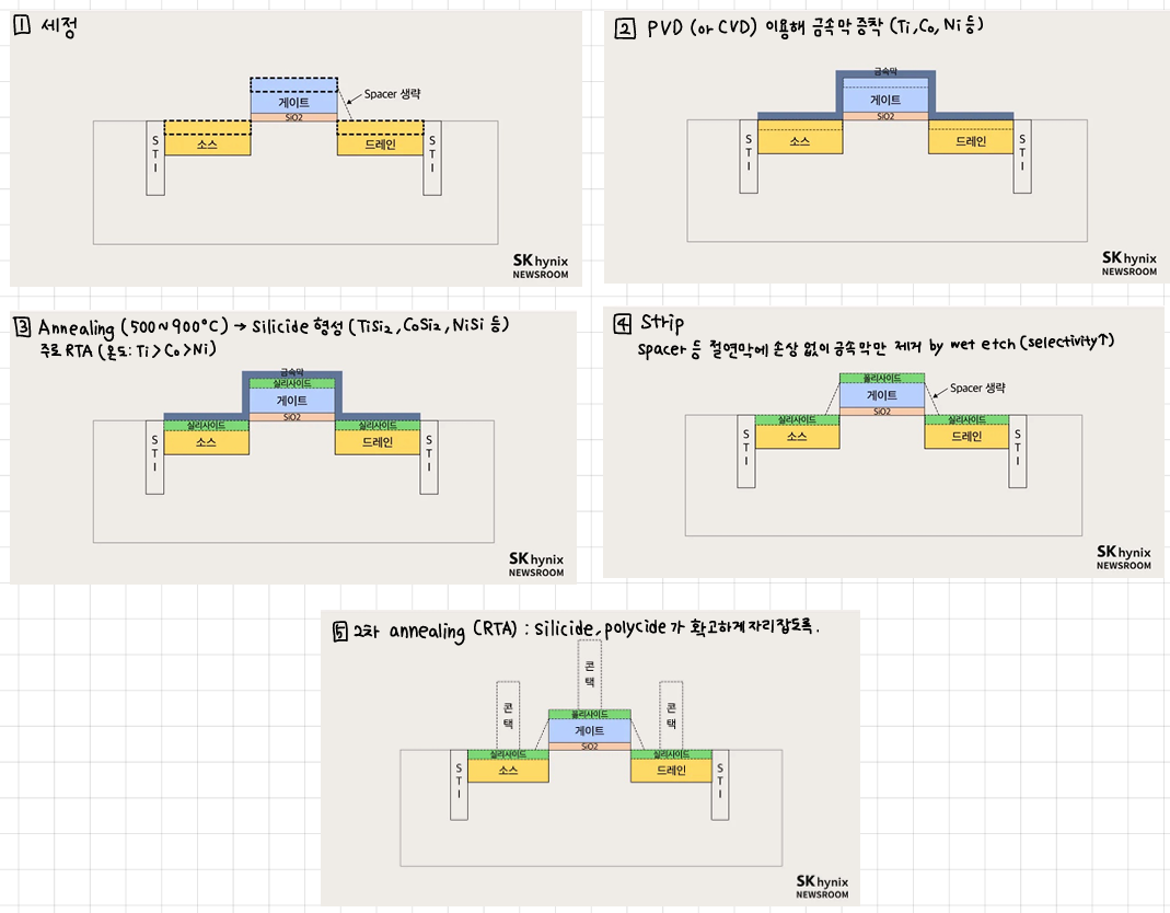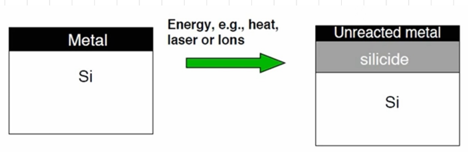 Silicide는 Si 위에 metal을 증착한 후 열 (annealing)을 가해주면 Si와 금속 이온이 서로 결합하여 형성됩니다. 이러한 silicide는 기존 Si보다 저항이 낮습니다. 즉, Si보다 저항이 낮은 silicide를 형성해 기생 저항을 낮출 수 있습니다.