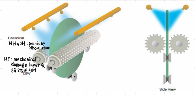 여기서는 brush scrubbing 방식이 가장 보편적으로 사용됩니다. 이는 brush와 particle 사이에 형성된 수막의 끌어당기는 힘을 이용해 particle을 제거합니다. (brush와 직접적인 contact을 하지 않습니다.)