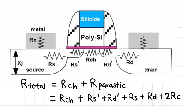 따라서 채널 저항 성분과 함께 이러한 기생 저항들이 더해져서 전체 저항을 결정하게 됩니다.
