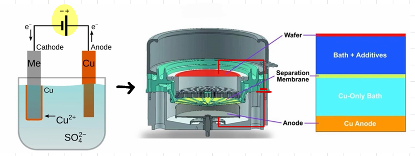 이후 웨이퍼를 전해도금액에 담궈 Cu 층을 성장합니다.