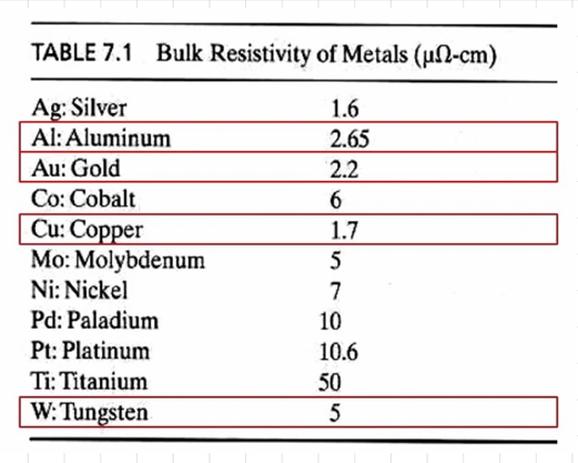 이러한 배선 공정에서 필요한 것은 낮은 비저항 (voltage drop과 RC delay를 최소화 하기 위해서), long-term reliability, thermal/chemical stability입니다. 또한 공정 난이도를 줄이기 위해서 패터닝이 쉬운 금속 물질, 저비용인 물질일수록 좋습니다.