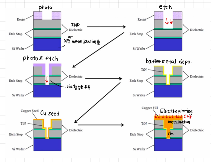 금속 배선 공정은 gate, source, drain interconnection과 같이 트랜지스터끼리 연결하여 원하는 형태의 회로를 구현하거나 회로들끼리 연결하는 등 층층이 metal line을 구현하거나 via를 형성하고 IMD (Inter Metal Dielectric; metal line 층끼리 분리하는 절연층)을 형성하는 등 다양한 역할을 합니다.