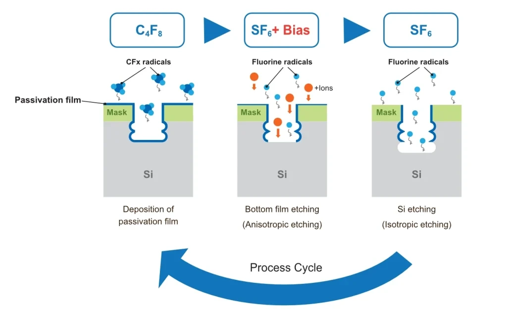 기존의 고종횡비의 channel hole을 etching하기 위해서 사용한 방법 중 대표적인 Deep RIE (Bosch process)에 대한 그림입니다. 비등방성 식각을 위해 C4F8 gas를 넣어 passivation layer를 형성하고, SF6 gas와 함께 bias를 인가해 바닥부분의 보호막은 제거합니다. 이후 SF6 gas를 이용해 화학반응을 시켜주면 (isotropic etch) 바닥 면의 Si막 식각이 되게 됩니다.