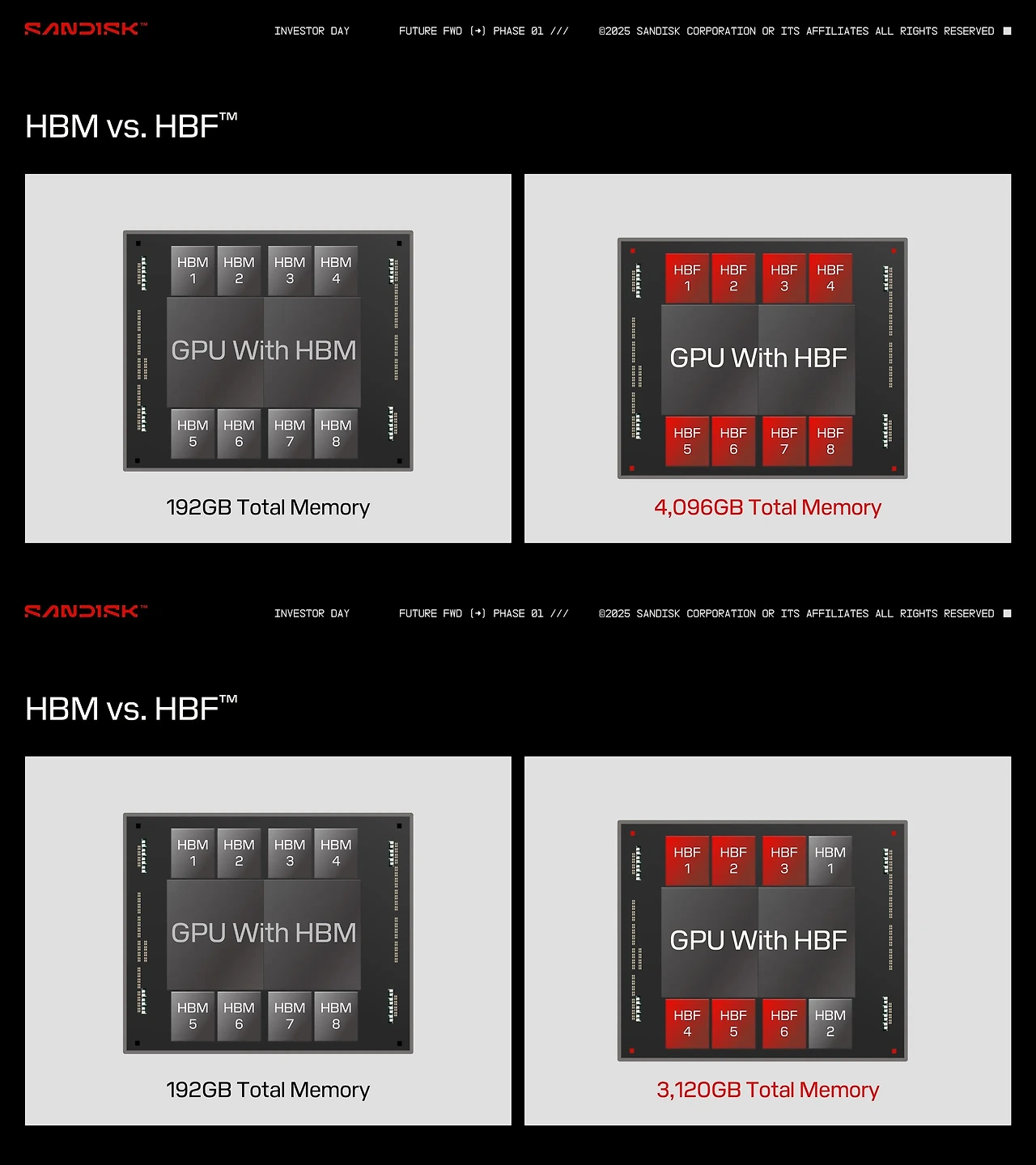 샌디스크의 1세대 HBF는 16층의 NAND 플래시를 적층해 512 GB의 용량을 구현한다고 합니다. 이 HBF 8개를 GPU에 붙인다면 4TB라는 큰 용량을 구현할 수 있습니다. 하지만 HBM보다는 대역폭은 낮을 것으로 예상되고 있고, 그렇기 때문에 HBM과 혼용해서 사용하는 방식도 제안되고 있습니다.
