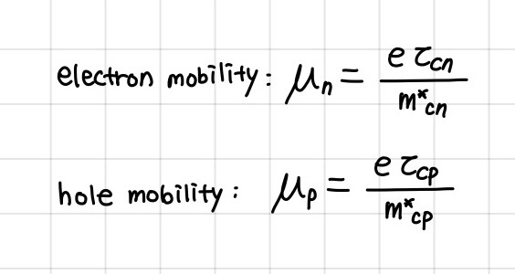 여기서 τ는 한 입자가 다른 입자와 충돌하기까지의 mean time을 나타내고 m은 유효질량을 나타냅니다. 이를 정성적으로 이해해보자면 충돌 사이의 평균 시간이 증가할수록, 즉 충돌이 감소할수록 mobility는 증가합니다. 또한, carrier의 질량이 증가할수록 carrier는 잘 이동할 수 없게 되어 mobility는 감소합니다.