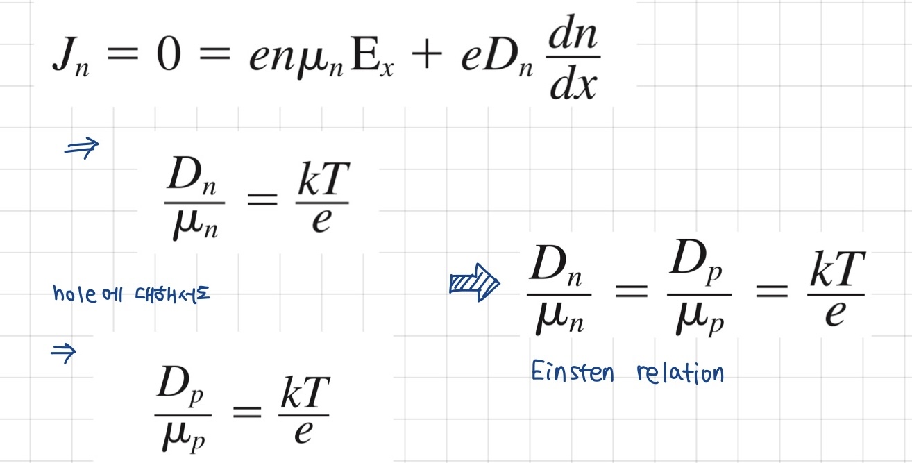 하지만 중요한 것은 thermal equilibrium 상태일 때는 개별 전자와 정공의 전류는 0이 되어야 합니다. 따라서 diffusion과 drift에 의한 전류 밀도가 서로 상쇄가 되어야 합니다. 이는 아래와 같은 식으로 나타낼 수 있고 이 식으로 부터 이동도와 확산계수의 관계를 나타내는 식을 구할 수 있습니다.