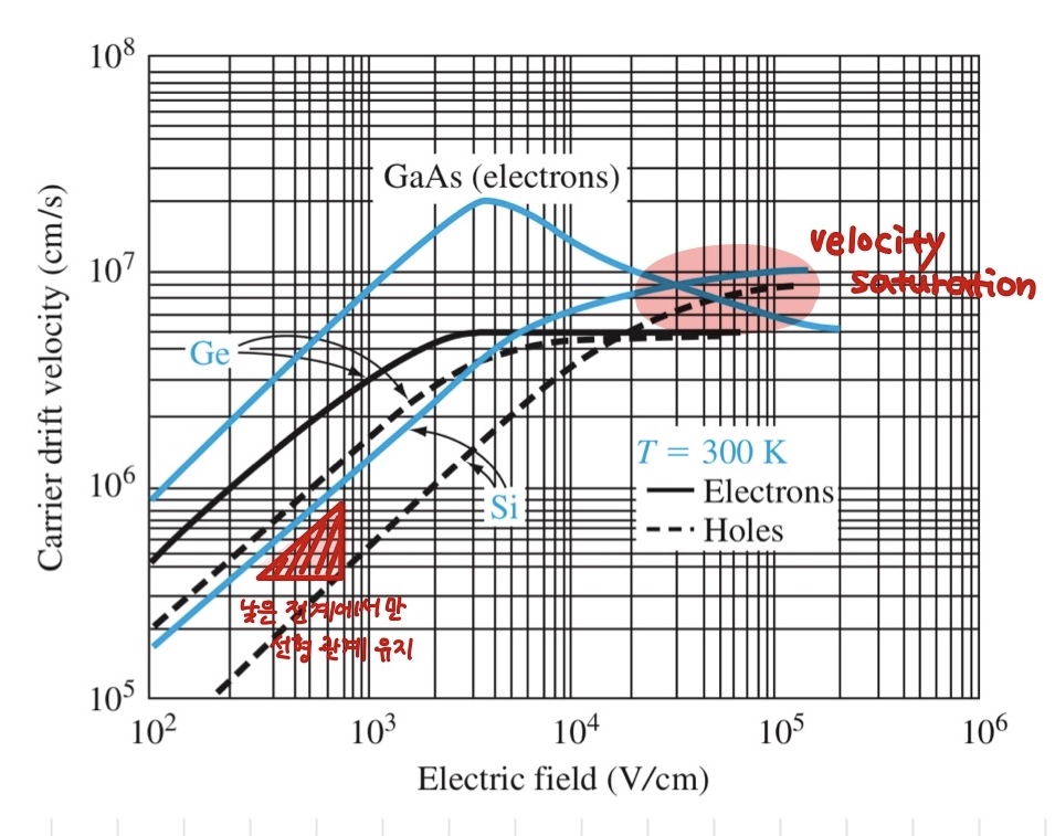 지금까지 drift에 대해서 이야기할 때 drift 속도는 E 전계에 대해 선형적으로 증가한다고 가정하였습니다. (vd ∝ μE) 아래의 그래프는 E에 대한 drift velocity를 나타내고, 그래프 곡선의 기울기가 바로 mobility에 해당합니다.