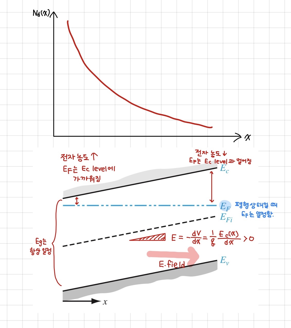 아래 그림처럼 불균일하게 도핑된 반도체를 가정해보겠습니다. 만약 반도체가 열평형상태에 있다면, 페르미 에너지 준위는 일정하게 유지되고, 이에 따라 에너지 밴드는 경사진 형태로 표현되게 됩니다. 이렇게 되면 그림에서 표현한 것과 같이 내부적으로 E.field가 형성되게 됩니다. 그렇게 되면 전계에 의한 drift도 음의 x 방향으로 존재합니다. (전자 기준) 마찬가지로 농도 기울기가 존재하기 때문에 양의 x 방향으로의 diffusion도 발생합니다.