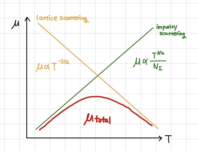 온도가 낮을 때는 impurity scattering이 우세하게 발생하며 이때 mobility는 온도에 비례한 관계를 갖습니다. 온도가 더욱 증가하게 되면 lattice scattering이 활발하게 발생하게 되어 mobility가 감소하는 형태를 갖게 됩니다.