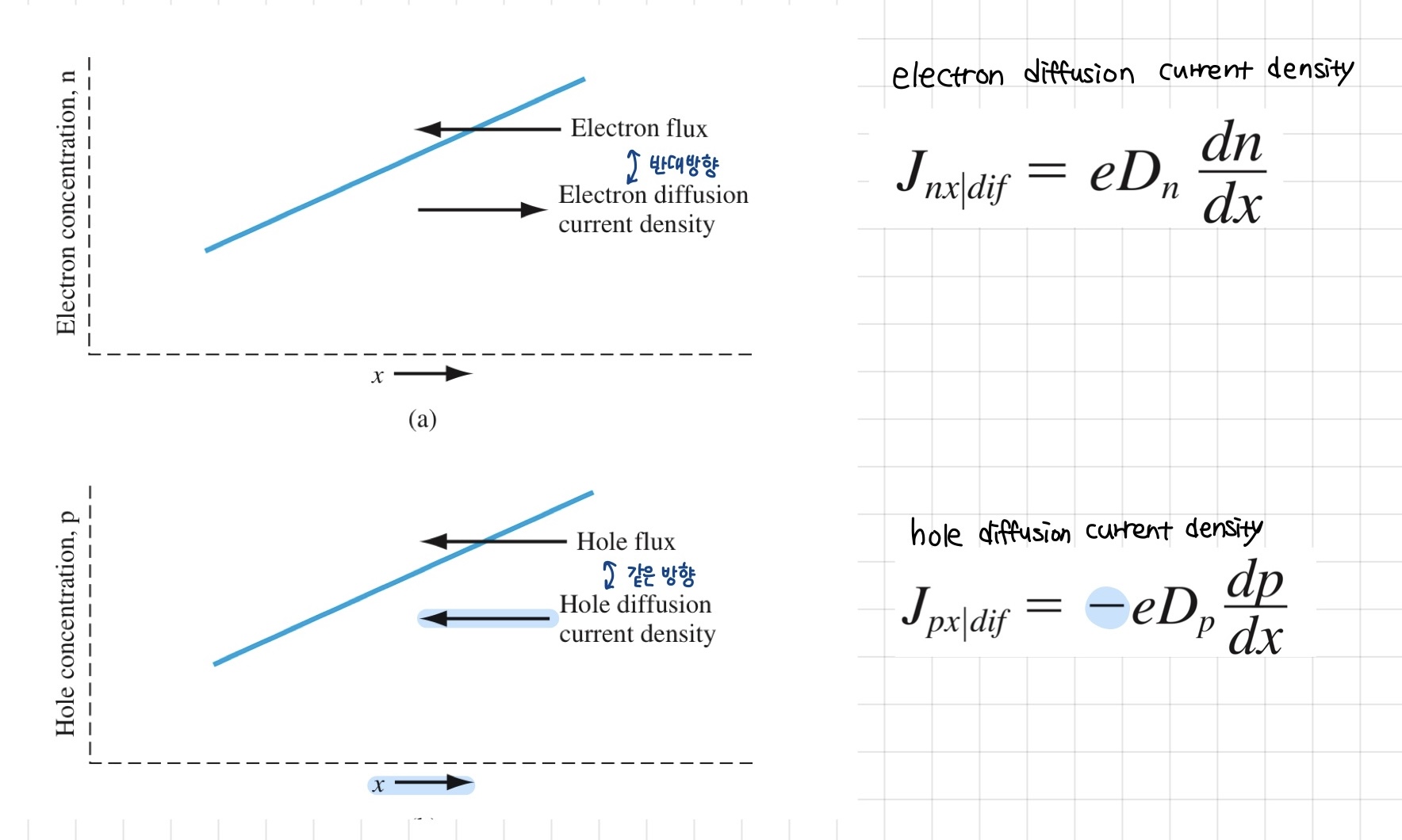 이러한 diffusion current는 캐리어 농도 기울기에 비례하는 값을 갖게 됩니다. 따라서 다음과 같은 식으로 나타낼 수 있습니다.