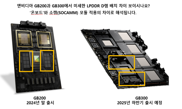 엔비디아 서버인 GB200 (작년 말 출시)를 보면, 그레이스 CPU 양쪽에 16개의 LPDDR이 장착됐습니다. 이때는 온보드 방식으로 연결을 했다고 하는데요, 차기작 GB300에는 LPDDR 칩 4개로 이루어진 SOCAMM 모듈을 4개를 결합할 것으로 보입니다.