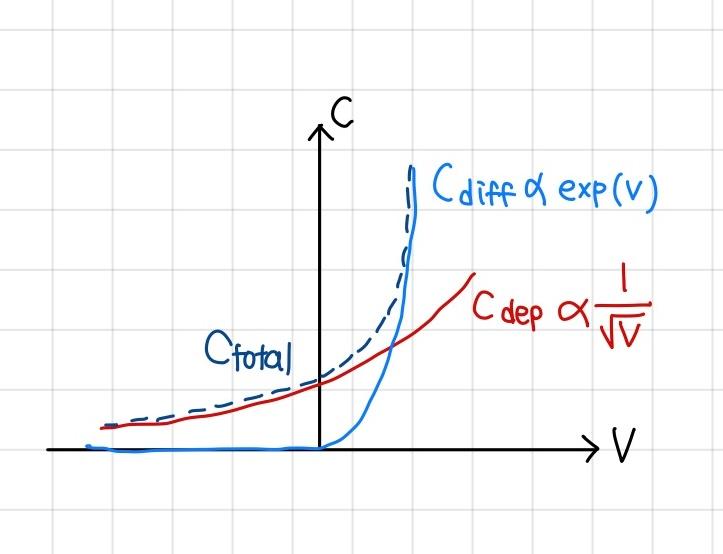 pn diode에서는 Cdiff와 Cdep이 서로 병렬로 연결되어 있는 형태라고 볼 수 있겠습니다. 따라서 두 capacitance 성분을 합하여 Ctotal을 아래와 같이 정의할 수 있습니다.