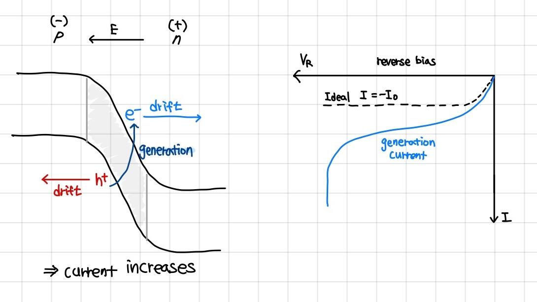 Reverse bias 하에서 depletion region에서 generation이 발생한다면 전자와 정공 쌍이 생성되게 됩니다. 이렇게 생성된 전자와 정공은 E-field에 의해 각각 n, p 영역으로 drift되어 이동합니다. 이로 인해 ideal 상태에서의 current보다 음의방향으로 더 큰 generation current가 발생하는 것을 알 수 있습니다.