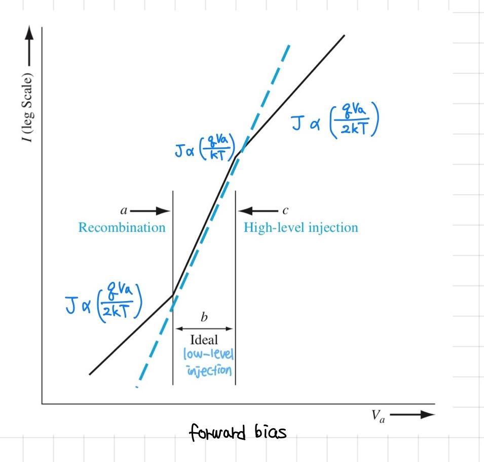 Recombination과 high-level injection 상태에서는 그래프의 기울기가 ideal한 상태보다 작아지는 것을 확인할 수 있습니다.