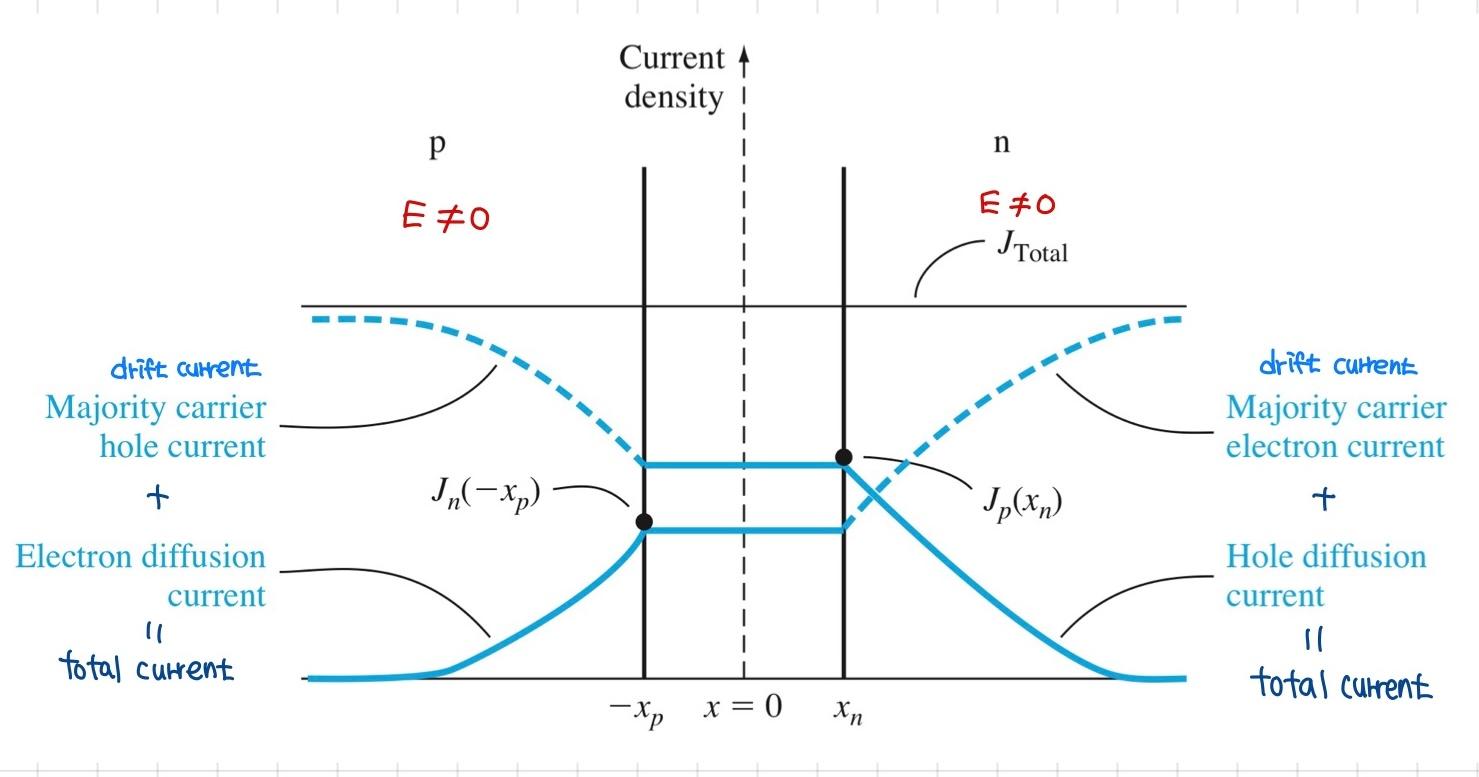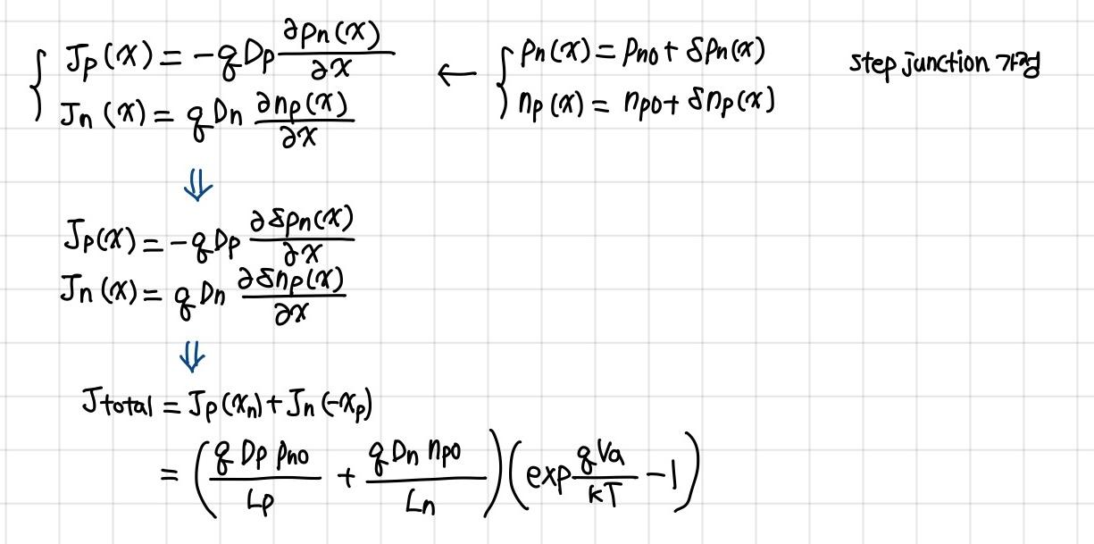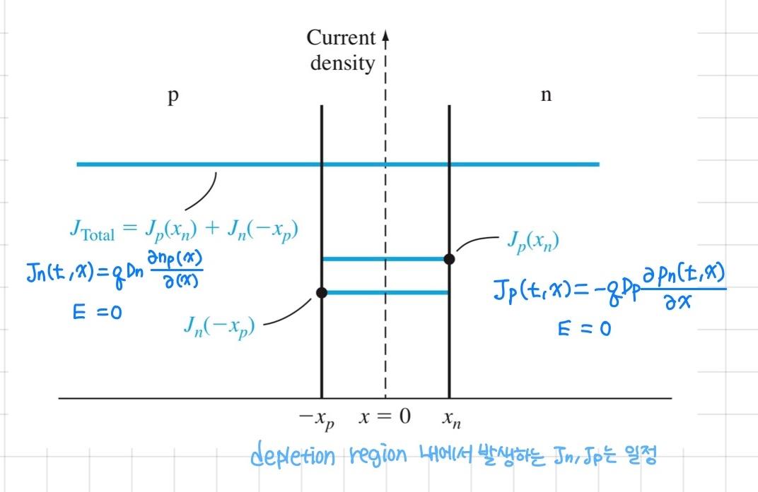 Electron, hole current는 연속적이기 때문에 결국 total current는 x = xn 에서의 minority carrier hole diffusion current과 x = -xp에서 minority carrier electron current의 합이 됩니다.