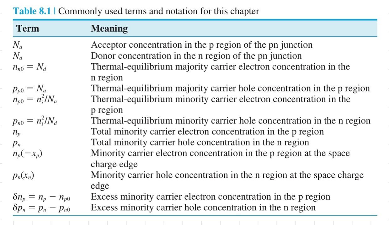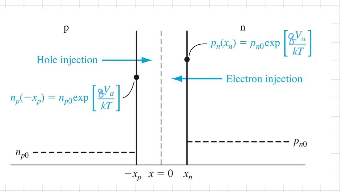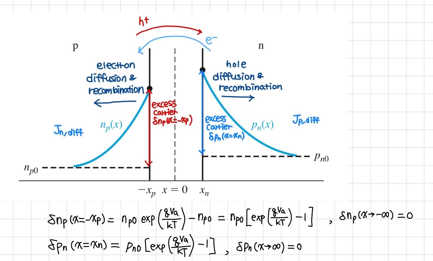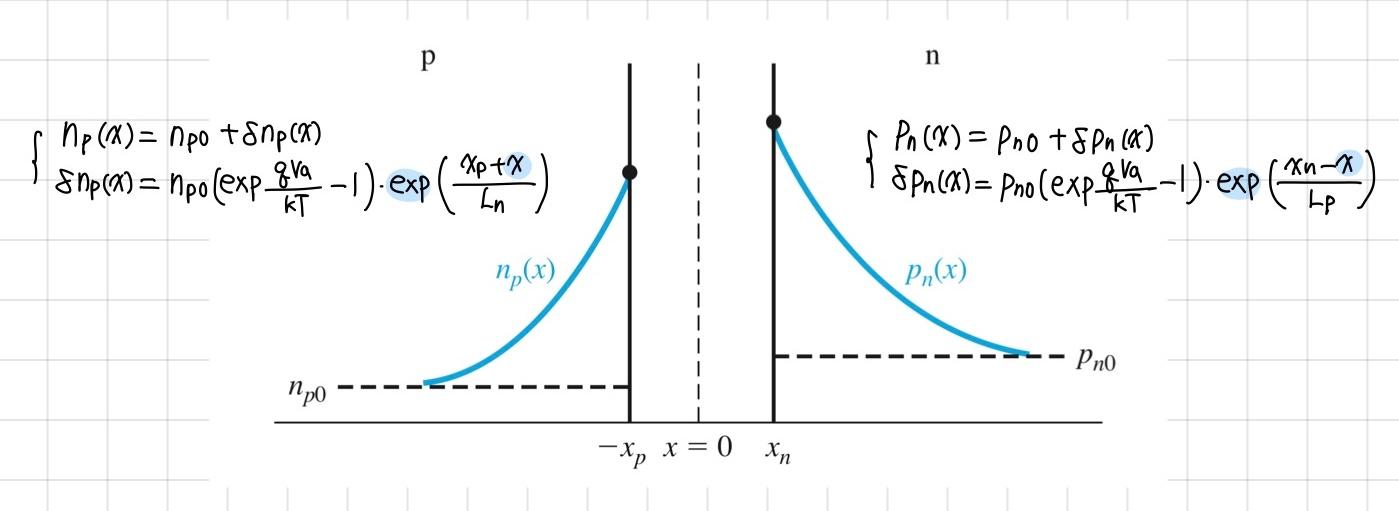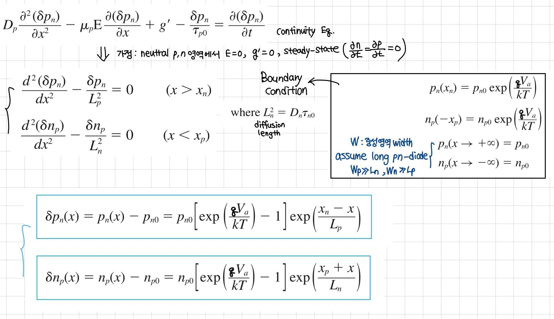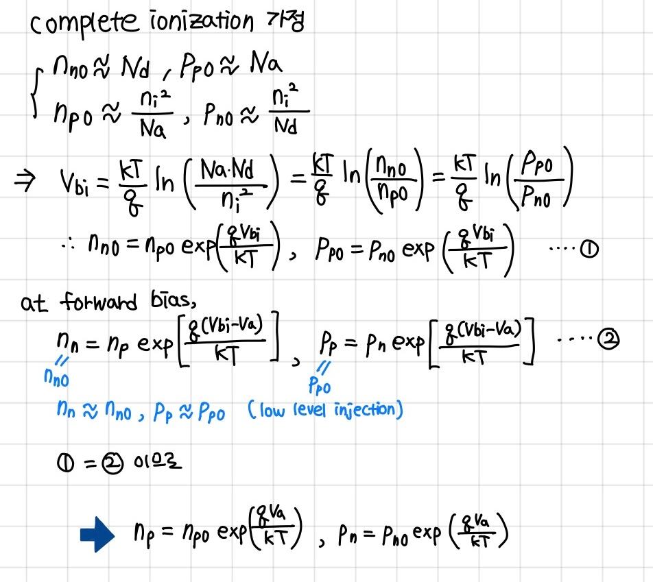 이때 한 가지의 가정을 했는데요, 바로 long pn-diode를 가정하였습니다. 이는 neutral 영역의 폭이 carrier의 diffusion length보다 충분히 길다고 가정하는 것입니다. 따라서 접합에서 충분히 멀리 떨어져 있게 된다면 pn은 pn0 (thermal equilibrium일 때)가 됩니다.