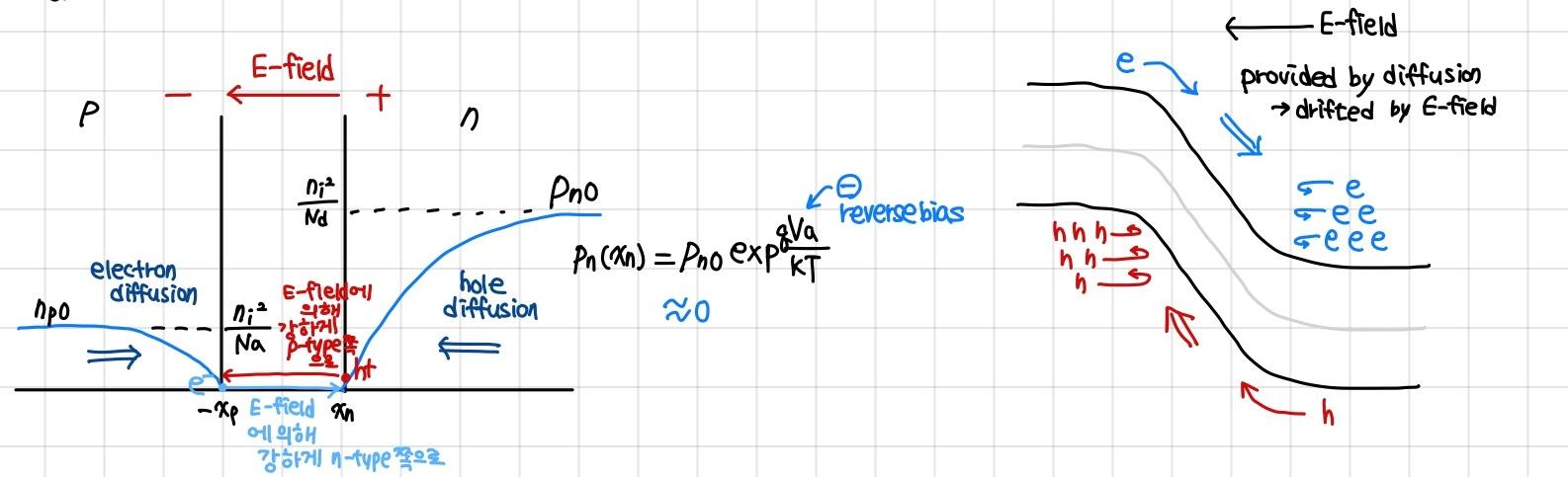 Reverse bias에서는 음의 Va 값이 인가되므로 x = xn, x= -xp에서 minority carrier의 농도는 0에 가깝게 됩니다. 즉, junction에서 먼쪽으로부터 junction 쪽으로 carrier가 감소하는 profile이 형성되고, 이에 따라 junction 쪽으로의 diffusion이 발생합니다.