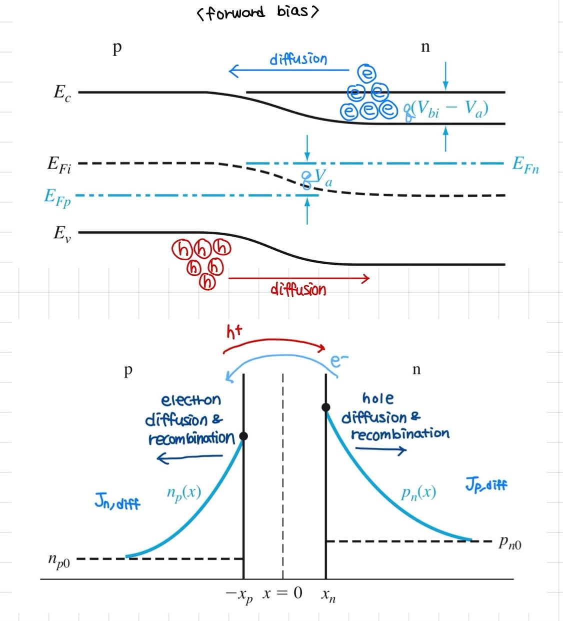 지금까지의 내용을 간단하게 요약하자면 forward bias가 인가될 때 낮아진 potential barrier로 인해 전자와 정공들이 diffusion되고 이렇게 diffusion된 carrier들은 minority carrier가 되어 diffusion 되면서 majority carrier들과 recombination되는 과정을 겪습니다.