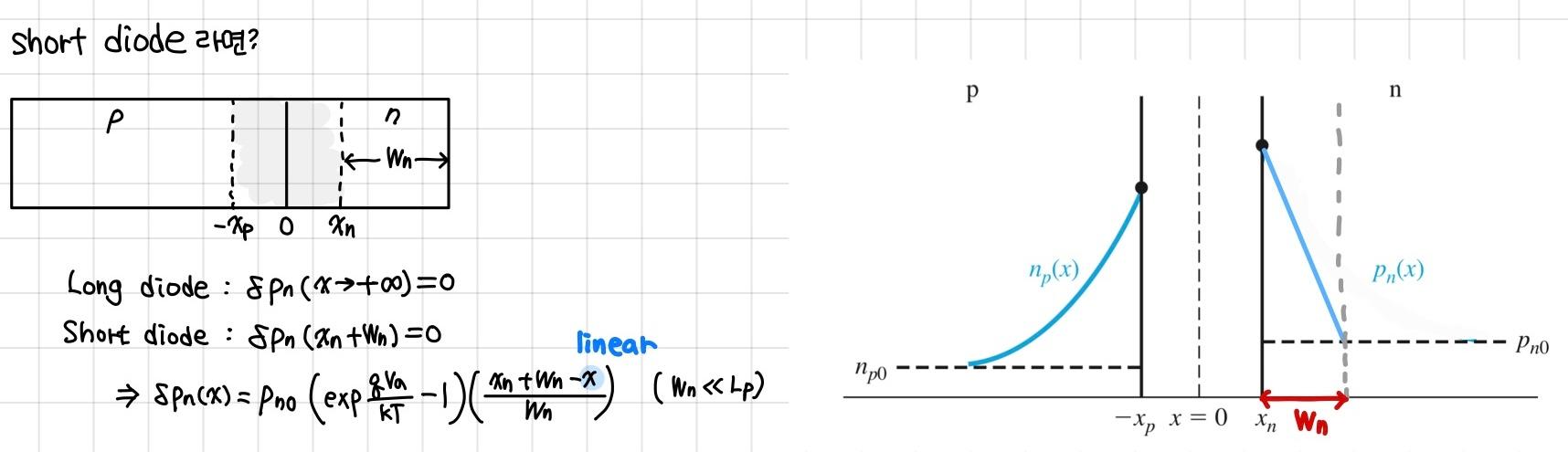 위의 그림처럼 n 영역의 폭이 minority carrier인 정공의 diffusion length보다 작을 때, boundary condition 값이 달라지게 됩니다.